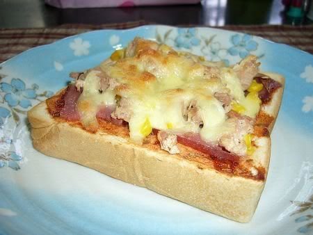 材料:厚片吐司,玉米粒,鮪魚,火腿,披薩絲.