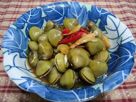 材料:蜆仔1斤.蒜頭4~5粒.薑片少許.紅辣椒1根