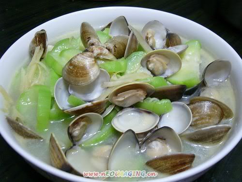 作法:1.絲瓜切片.薑切絲.蛤蜊洗淨備用