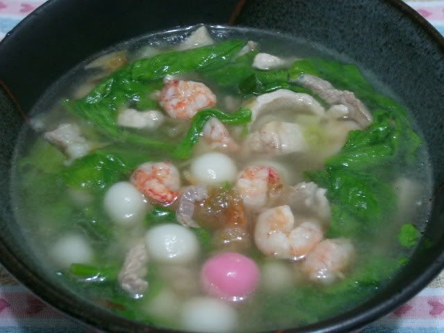 材料:紅.白小湯圓1盒.蝦仁.肉絲.茼蒿.蔥.紅蔥酥.白胡椒粉